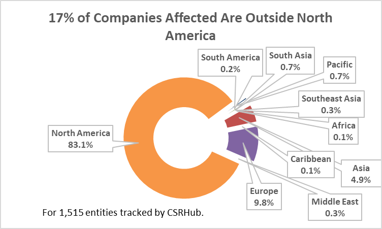 While 83% of the affected companies are from North America, there are a large number of European (147) and Asian (74) companies that may need to report. Of the 1,230 US companies, only 313 are headquartered in California. Four other US states (Illinois, Massachusetts, New York, and Texas) have more than 50 affected companies. Almost ten percent of the affected companies are in Europe.