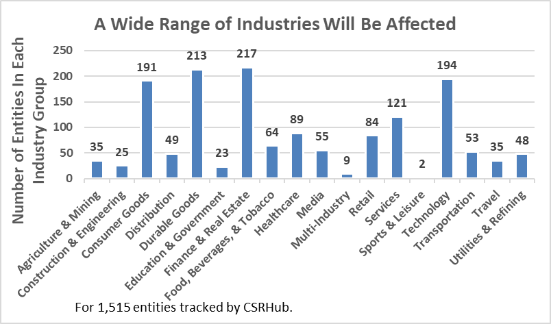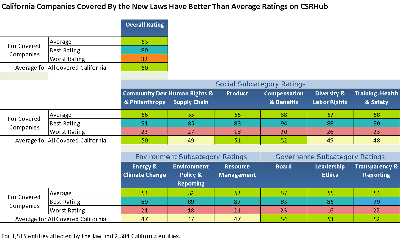 CSRHub provides a consensus sustainability rating for any entity globally that has been rated by at least a few expert sources. We were able to find data in our system for 1,515 of the companies on the California list (click on the link to see them on our site). We believe that most of the remaining entities on the list are too small to be required to report under the regulation—at least initially. Therefore, our sample is probably a good representation of the types of companies that will be affected by this disclosure legislation.